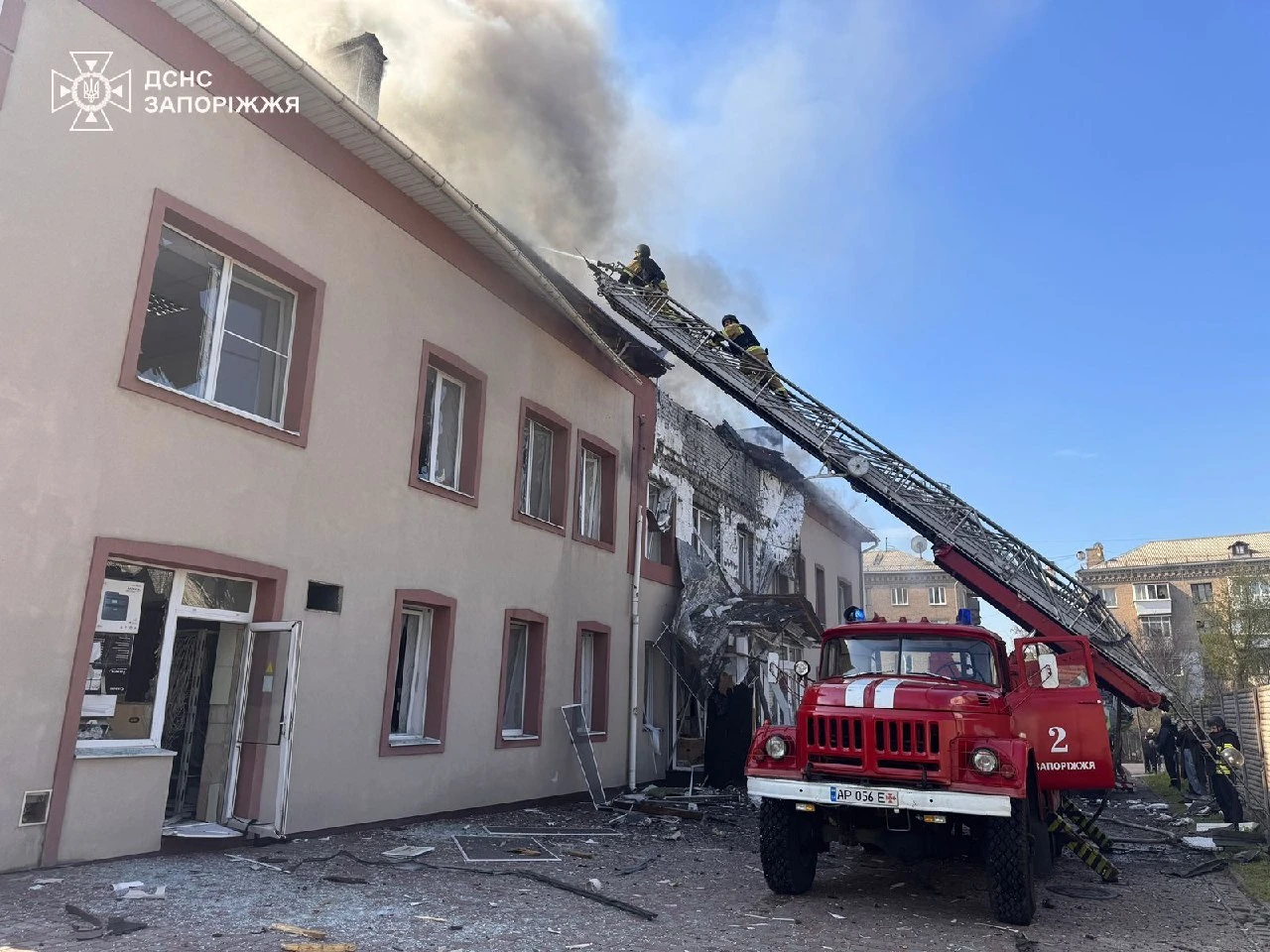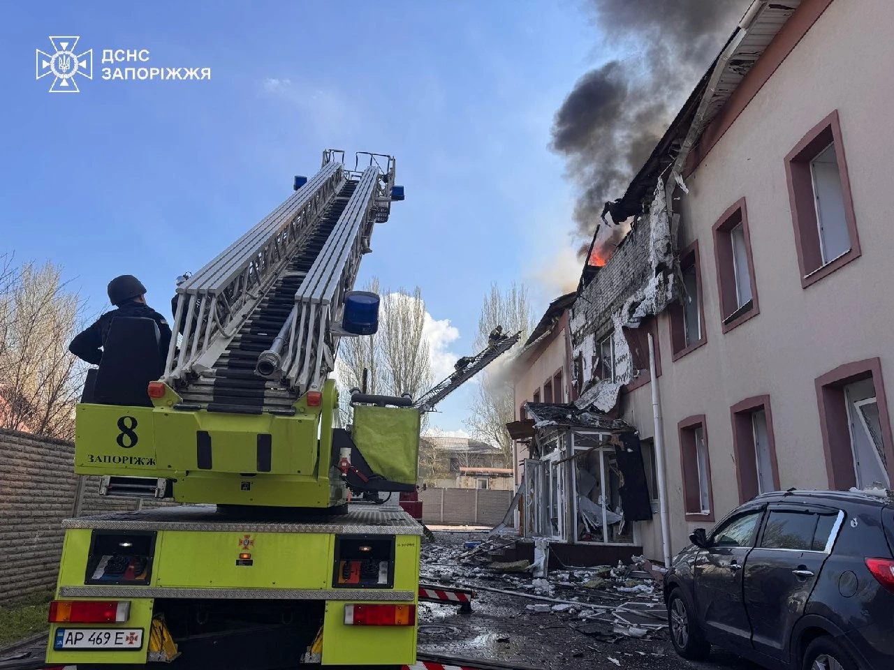 Последствия российской атаки на офисное здание в Запорожье. На месте работают экстренные службы. Информации о пострадавших нет.